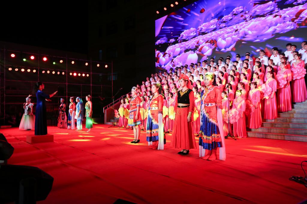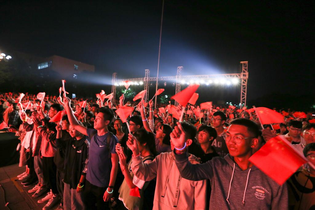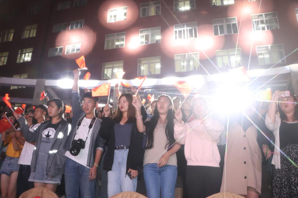 日照校区现场,彩灯交替,人潮澎湃,阳光会场一面五星红旗悬挂主席台正上方,鲜艳夺目的中国红与星月交相辉映,“不忘为国弘文初心”和“牢记立德树人使命”的条幅环绕两侧,观众席接近百米的长龙、几千人的队伍围绕广场的台阶顺次而坐,人人手持小国旗和荧光棒,不时传来为演出加油的阵阵欢呼。