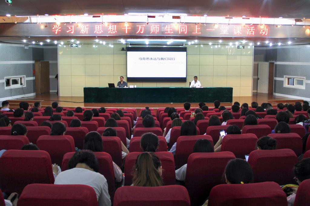 为持续深入学习贯彻习近平新时代中国特色社会主义思想和党的十九大精神,深入学习宣传贯彻习近平总书记在北京大学师生座谈会和纪念马克思诞辰200周年大会上重要讲话精神,根据教育部和省委教育工委的通知要求,6月13日下午,我校举行“学习新思想千万师生同上一堂课”活动。山东高校习近平总书记重要讲话精神讲师团授课专家,马克思主义学院孙迪亮教授、肖芳副教授分别作了题为“马克思永远与我们同行”和“不忘初心,牢记使命,做新时代的不懈奋斗者” 的专题授课。