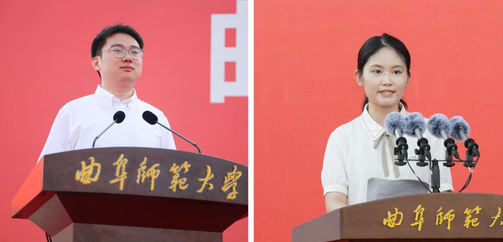 校友代表张强教授和刘峰教授为新生送上祝福。张强鼓励同学们敢于探索,勇于尝试,追求真理,开拓创新,保持好奇心,心怀爱国之情,笃行报国之志,将个人理想与国家命运紧密相连,在时代的浪潮中书写属于自己的闪光青春。刘峰首先祝贺各位新同学迈入曲阜师大这所文化底蕴浓厚的高等学府,分享了自己求学奋斗的心得,勉励同学们志存高远,脚踏实地,真抓实干,守正创新,在美丽曲园不负韶华、奋力逐梦。